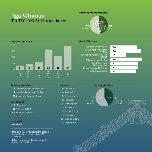 We had a group of about 30 people tour our facilities. A total of 156 people attended the AGM. There was a pretty even spread across Kāhui, gender and age. It was great to see a wide range of people coming along to share their voice.
