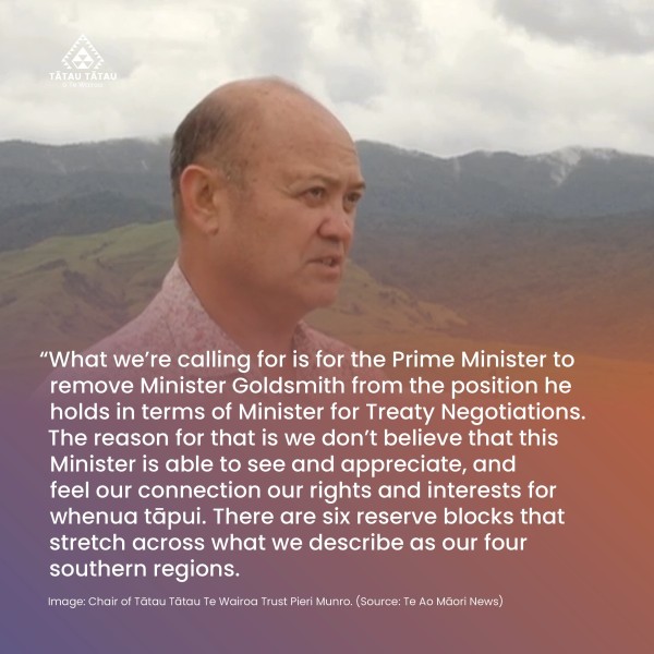 Tātau Tātau o Te Wairoa (TToTW) is calling for the removal of Minister Paul Goldsmith as Treaty Negotiations Minister following the inclusion of six Department of Conservation (DOC) reserves in the Ngāti Ruapani mai Waikaremoana settlement claim.